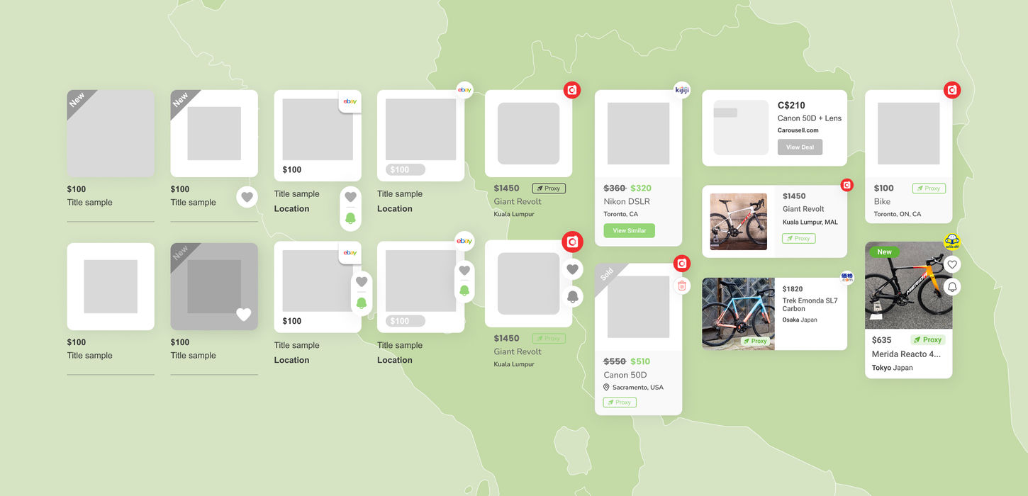 Achieving efficiency in the listings was particularly challenging, given their role as a comprehensive forefront of key metrics and data, including the listing image, source, shipping availability through proxy services, price, title, location, listing status, and options to favourite or receive price alerts.